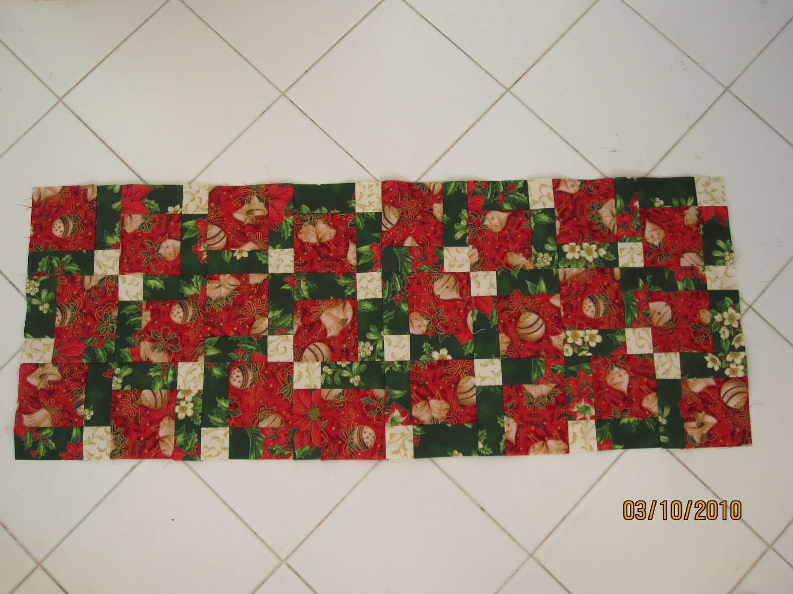 Tal como tinha prometido aqui estão as fotos do meu "runner" de Natal. O "runner" é feito utilizando a técnica de " Disapearing nine patch" ,se quiser aprender pode consultar um tutorial aqui. É uma técnica muito fácil mas o efeito é espectacular, esta é apenas uma combinação de inúmeras possíveis é só usar a imaginação.
